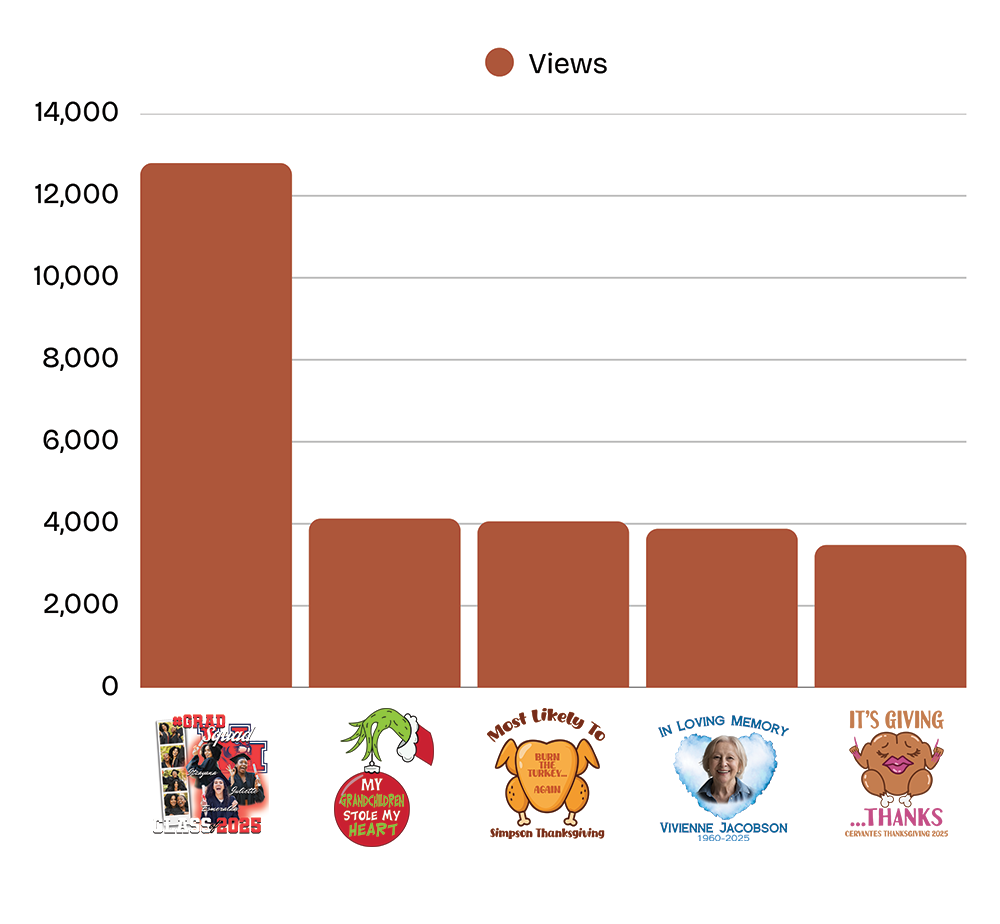 Graph 1: Organic Reach (Top 5 Viewed) First, they have to find it. This chart tracks my top-performing designs by unique views across different seasonal categories. By leveraging backend tools—strategic tagging, metadata optimization, and category mapping—I was able to drive over 100,000 organic impressions to these designs without paid ad spend.